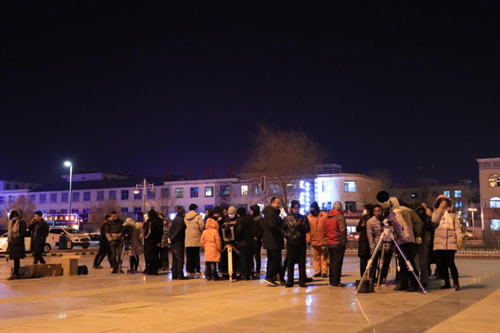 2018年1月31日,青海观测站科普小组负责人李阳组织观测站职工在德令哈市奥运广场给广大群众举办“走进科学,亲近天文”的观“超级蓝血月”科普活动,活动现场准备了三台高级天文科普望远镜以及相关天文知识的展板,每台望远镜都有专人负责为市民们讲解,从使用望远镜观看“蓝血月”、到用手机通过望远镜拍摄“蓝血月”等。前来观超级“蓝血月”的市民在工作人员的引导下井然有序的排队进行观看,好多观看者表示第一次使用专业望远镜观看月亮,都兴奋不已,为了看清楚超级“蓝血月”的变化过程甚至连续多次排队进行观看,陆陆续续接待了百来名观月者。虽然当天晚上室外温度特别低,但是丝毫不影响市民们观看“蓝血月”的热情,都为看这千载难逢的超级“蓝血月”激动不已。活动持续了四个多小时,到晚上十点半大家才恋恋不舍的离去。市民们纷纷表示非常感谢青海观测站举办此次活动,让大家能亲眼目睹这罕见的一刻,也希望以后能有更多的机会参加类似的天文科普活动。