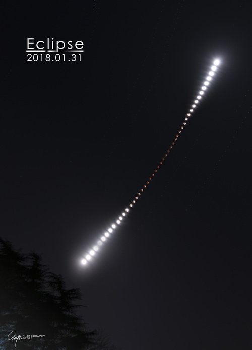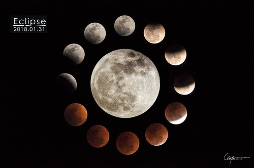 活动二:2018年1月31日18时,岛城许多的天文和摄影爱好者们纷纷聚集在青岛观象山西山平台,架设好各种长枪短炮等摄影设备,静候月亮从浓雾中的现身,18点45分,天气逐渐转好,月亮也悄悄的露出身影,羞羞答答地出现在苍穹中;19点48分,月亮开始一点一点的被阴影吞噬,备受关注的“天狗吃月”如期上演,人群中开始不断的出现惊叹声;20点51分,月亮逐渐泛出红色,食既开始了,有人呐喊、有人欢呼,快看快看月亮红了好美啊!月亮这时像披上了红色的沙幔,颜色也越来越深;21:30分,地球的影子完全遮住了太阳的光,月食进入食甚阶段,整个月面变成了古铜色,暗红的样子蔚为壮观,天空中的星星也好像亮了许多,猎户座、天狼星、着实亮眼。随着时间的推移,月亮的脸不断变化,在这一个多小时里上演着大自然的奇观和对人类的馈赠;22点08分月亮逐渐离开地球的影子,继续演绎着盈亏的变化,开始生光;23点11分,月亮终于完全走出了地球的影子,恢复原来的样子,一场精彩演绎的日月地大戏就此谢幕。