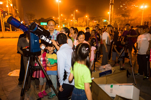 傍晚,工作人员在仙林湖公园的广场上架起了数架天文望远镜,广场上路过的行人很快就被这些望远镜吸引了过来,每架望远镜的后面竟然排起了十几米长的队伍。人们在目镜前凝望,38万公里远的月亮立刻就被拉近到了眼前,月面上的环形山、月海、山地、撞击辐射条纹在望远镜中清晰可见。看到放大了的月亮之后人们发出阵阵惊叹,这使得周围排队等候观测的人们更加期待。观众中有很多小朋友,他们在看到望远镜中的景象后,提出了很多问题:“为什么月亮不是圆的”、“月亮上怎么那么多坑”、“我们为什么看不到月亮的背面”......现场工作人员一边指导着人们利用望远镜观测,一边为人们解答各种各样有关月亮的疑问。“月亮上暗的部分是月海,那里是月球火山喷发出来的玄武岩,颜色比较黑;亮的部分是高地,主要是斜长岩,颜色较亮”;“每一处月海外形上都是一个圆,它们其实是月球上被岩浆覆盖的巨大的环形山”;“月亮总是以一面朝向地球,这是潮汐力作用的结果”... 活动期间,工作人员主动向公众普及了许多天文知识。