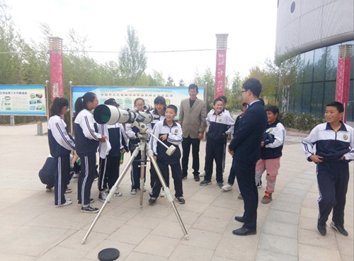 下午14:00时活动开始,现场摆放天文科普展板,架设科普望远镜,并配备天文科普讲解员6人。德令哈市第二中学的老师、家长和学生以及旅游者参加了本次活动,活动还吸引了德令哈市民前来参观。科普部主任李阳给学生和市民做了一场生动简单的科普讲座。随后孙继先和王敏带领学生体验用科普望远镜观察天空和远景,学生们为能够清晰地看到天空和远处树木兴奋不已,也对望远镜成倒立像表示出疑惑。罗春盛为学生们详细讲解了科普望远镜的成像原理。活动现场气氛热烈,有趣而深奥的天文知识激起了学生们的求知欲,大家对宇宙的奥秘产生了浓厚的兴趣,纷纷表示回到课堂要更加努力地学习知识。