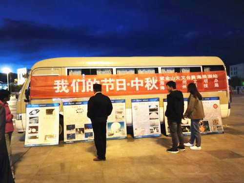 为隆重庆祝中华人民共和国成立70周年、青海解放70周年,在中秋佳节来临之际,本着宣传“科技服务科学、服务大众”的工作原则,努力提高德令哈市广大干部职工、农牧民、青少年科学文化素质,在海西州直机关工委文明办、海西州科技局和德令哈市城市管理综合行政执法局的大力支持下,2019年9月13日(农历八月十五)晚,青海观测站党支部在德令哈市奥运广场举办了“我们的节日—中秋”赏月科普活动。